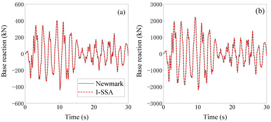 Base reaction time history curves of the frame equipped with LVDs using the Newmark and I-SSA: (a) PGA = 70 Gal, (b) PGA = 400 Gal.