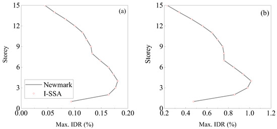 Maximum IDR envelopes of the frame equipped with LVDs using the Newmark and I-SSA: (a) PGA = 70 Gal, (b) PGA = 400 Gal.