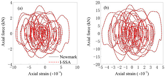 The damping coefficient c of the LVD was set to 0.2 kN/(mm/s). Figure 16, Figure 17 and Figure 18 illustrate the time history curves of the top displacement, base reaction, and maximum IDRs of the frame, respectively. Additionally, Figure 19 compares the relationship between axial force and strain of LVD #5. These figures clearly indicate that the global and local responses of the LVD-equipped frame obtained from both the I-SSA and Newmark method are nearly identical.