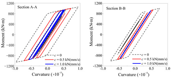 A comparative analysis of the moment–curvature curves at sections A-A and B-B demonstrates significant attenuation following the installation of LVDs in Figure 21. A substantial portion of energy dissipation previously controlled by hysteresis is now absorbed by the LVDs, thereby reducing the plastic energy dissipation in the beams and enhancing structural safety. Additionally, LVDs dissipate more energy as the damping coefficient increases, further mitigating frame hysteresis. As shown in Figure 22, the white circles are nodes without assigned lumped mass and the black circles are nodes with assigned lumped mass, it compares the nonlinear element distribution of the frame equipped with LVDs of different damping coefficients. When the damping coefficient increases from zero to 1.0 kN(mm/s), the number of yielding elements decreases from 44 to 33. Obviously, the energy dissipated by the LVDs results in a reduction in the total structural plastic energy dissipation, allowing more elements to remain in the linear elastic state.