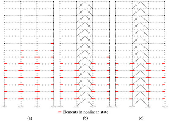 Yielding elements distribution of the frame equipped with LVDs of various damping coefficients: (a) c = 0, (b) c = 0.5 kN/(mm/s), (c) c = 1.0 kN/(mm/s).