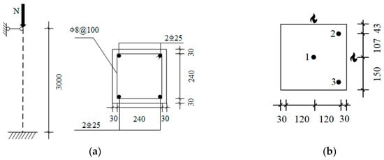 Configurations of reinforced concrete columns: (a) specimen size and cross-sectional details; (b) locations of thermocouples.
