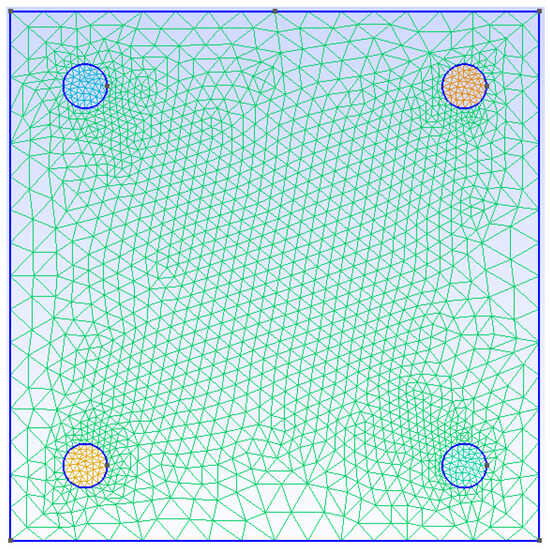 Conduction is considered the primary heat transfer method within concrete columns, while convection and radiation are the main mechanisms of heat transfer from the external environment to the surface of the concrete columns. During thermal analysis, all selected specimens undergo a ISO 834 standard fire. The convective coefficients for the fire-exposed and unexposed surfaces of siliceous concrete are 25 W/(m2·°C) and 9 W/(m2·°C), respectively, with an emissivity of 0.8. The density of normal-strength concrete is 2300 kg/m3, and that of high-strength concrete is 2400 kg/m3. The thermal properties of concrete and steel are derived from the EC2 []. The specific heat capacity Cc and thermal conductivity λc of siliceous aggregate concrete are shown in Equation (1). The water content in concrete is calculated as 6% by weight. The discretization for plane sections of different shapes is possible by using triangular and/or quadrilateral elements, and the grid division of the concrete column cross-sectional temperature field model is shown in Figure 2.
