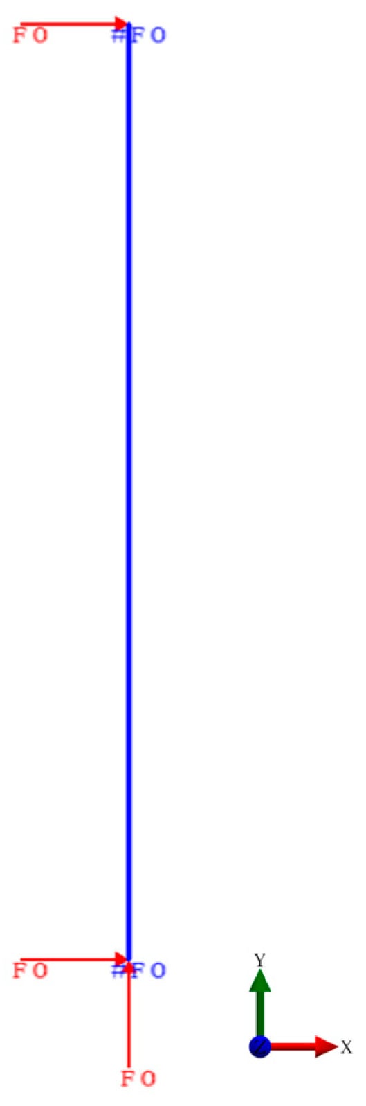 In this study, 2D beam elements are used to model columns entirely exposed to fire on all sides, while 3D beam elements are employed in cases of uneven exposure to capture the asymmetric response of the columns. The load is applied and maintained constant at the start of the simulation. Transient analysis is used throughout the fire exposure to calculate the evolution of displacement. The fire resistance represents the duration during which a concrete column maintains its load-bearing capacity, stability, and structural integrity under fire exposure. In the simulation, column failure occurs when the analysis can no longer reach an equilibrium state, leading to the termination of the simulation, indicating the time of failure. In experiments, it is determined according to the ISO 834 standard []. Front view of the structural model is shown in Figure 3.