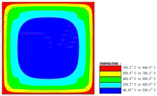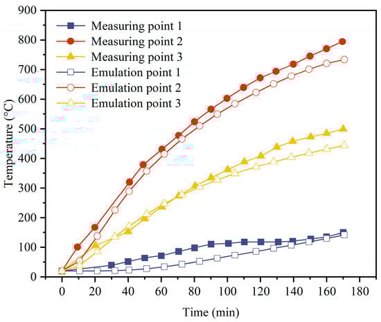 The reliability of the established finite element model is validated using experimental results. The temperature contour is shown in Figure 4, and the comparisons between the time–temperature simulation results and experimental results are shown in Figure 5. From the figures, it can be seen that the simulation results are satisfactory, with the maximum temperature difference between the measured and calculated values being 63 °C. The reason for the discrepancy is that SAFIR handles the influence of moisture content in a simplified manner when calculating the transient temperature of concrete, and it assumes that all moisture evaporates within a narrow temperature range without any transfer, resulting in the simulation curve generally being above the experimental temperature curve.