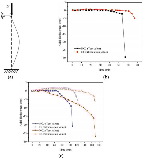 Structural model validation: (a) column deformation under loading and high temperatures; (b) comparison of axial displacements (HC2); (c) comparison of axial displacements (HC3, NC2).