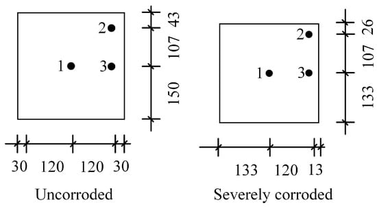 Under the effect of the volumetric expansion of the corrosion products of the stirrups, the concrete cover on the surface of the stirrups will crack or even spall, resulting in a reduction in the effective cross-sectional area of the concrete. The effective width of the concrete cross section after rust expansion and spalling can be calculated using Equation (9). The calculated effective width can be found in Table 5. Figure 7 illustrates the cross-sectional dimensions of the concrete column before and after corrosion, as well as the positions of the thermocouples.