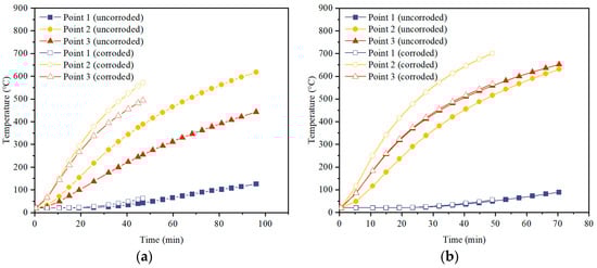 Figure 8 presents temperature comparisons between the uncorroded and severely corroded columns at the same measurement points, highlighting the significant impact of corrosion on the temperature field across the cross section. Corrosion undermines the effectiveness of the concrete cover and accelerates the rate of temperature rise at the location of the steel reinforcement. Notably, the temperature field of concrete columns exposed to fire on two adjacent sides is most affected by cross-sectional damage. At measurement point two, for instance, the location of the rebar in the uncorroded column requires an additional 64 min to reach the same temperature as the severely corroded column, the temperature rise curve of which is shortened by 56% due to the corrosion.
