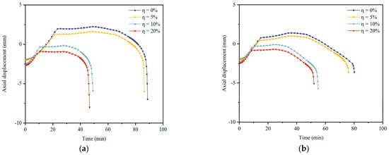 Figure 9 shows the axial displacement–time curves for columns with different corrosion degrees. It can be observed that in the initial phase of the simulation, the columns exhibit axial compression under the load, followed by axial expansion due to the high temperatures affecting the concrete. As the corrosion rate increases, the peak value of axial displacement caused by concrete expansion gradually shifts to the left, indicating that the deterioration in the mechanical properties of steel and concrete materials under fire becomes more severe with the increasing corrosion. It is important to note that minor corrosion (η = 5%) has a small impact on the axial displacement of the column, but severe corrosion weakens the axial expansion response of the concrete material, reducing the peak value of axial expansion by up to 2.9 mm. In the second stage, the process of slow axial displacement decline is shortened and the rate of axial deformation of the column accelerates, leading to premature failure of the column by up to 98 min. With a concrete cover thickness of 20 mm, the initial compression difference is only 0.4 mm, while with a concrete cover thickness of 30 mm, the initial axial compression increases with the corrosion degree.