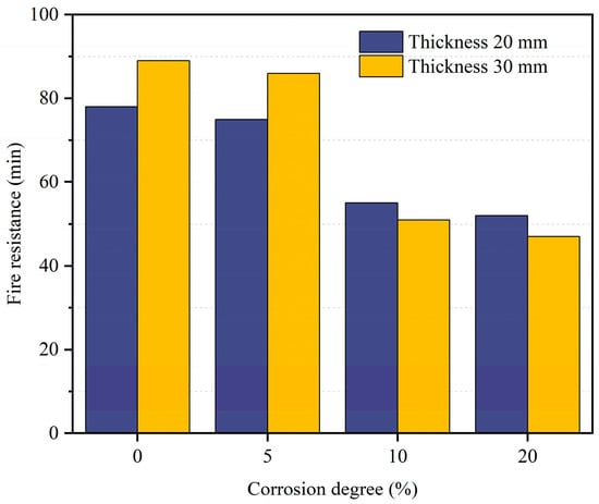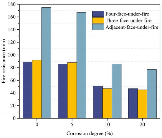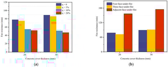 The concrete cover can effectively delay the weakening effect of high temperatures on the performance of steel bars, ensuring that the steel bars do not lose their load-bearing capacity rapidly under high temperatures []. The impact of the thickness of the concrete cover on the fire resistance of concrete columns is shown in Figure 16. It can be seen from the figure that increasing the thickness of the concrete cover does not provide effective protection for columns with severe corrosion. For uncorroded columns, however, increasing the thickness of the concrete cover can effectively extend their fire resistance. The fire resistance increases by 12%, 20%, and 10%, respectively, for columns exposed to fire on all four sides, three sides, and two adjacent sides.