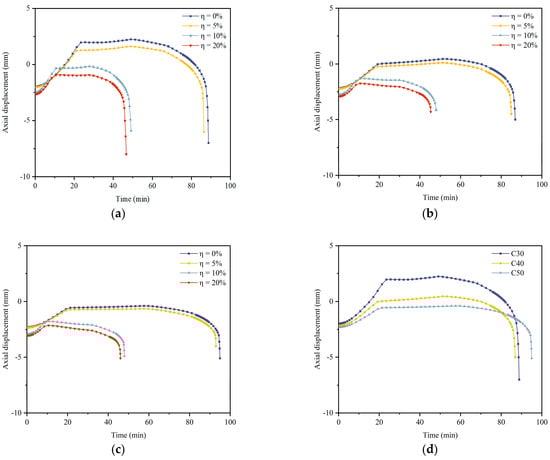 Figure 12a–d depict the time–axial displacement curves for concrete columns with different strengths (C30, C40, C50) and a concrete cover thickness of 30 mm. As the concrete strength increases, the curves become flatter, transitioning from three stages to two stages. This flattening is primarily due to the decrease in concrete’s deformation capacity with the increased strength. Figure 12d reveals that with higher concrete strength, the axial displacement caused by thermal expansion is reduced. For instance, the displacement due to thermal expansion for C30 concrete is 2.6 mm greater than that for C50 concrete. This reduction in expansion deformation capacity is mainly due to the larger loads applied to high-strength concrete at the same axial compression ratio, which suppresses the concrete’s ability to expand. Tan [] also reached the same conclusion through their experiments.