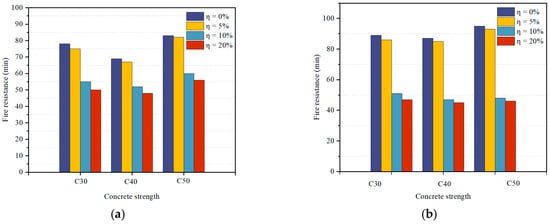 Fire resistance of the corroded reinforced concrete columns with different concrete strengths: (a) 20 mm-thick concrete cover; (b) 30 mm-thick concrete cover.