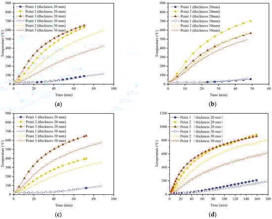 Comparing Figure 14a,c,d, it is observed that the increase in the thickness of the concrete cover most notably slows down the rate of temperature rise at the measurement points of the concrete column exposed to fire on all four sides. Moreover, comparing the duration of the temperature rise curves at the measurement points under three different fire exposure methods—on all four sides, three sides, and two adjacent sides—it is found that when the thickness of the concrete cover increases from 20 mm to 30 mm, the fire resistance increases by 12%, 20%, and 10%, respectively. This demonstrates that an increase in the thickness of the concrete cover does enhance the fire resistance of concrete columns to a certain extent.