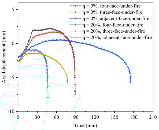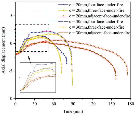 Axial displacement–time curves of the reinforced concrete columns with 30 mm-thick concrete cover under different types of fire exposure.