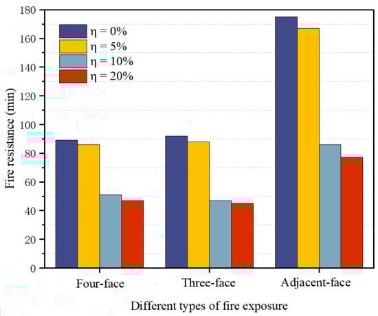 Figure 10 and Figure 11 illustrate the variations in fire resistance of concrete columns with different corrosion degrees. The figures indicate that when the corrosion degree is low and the concrete cover remains intact, the impact of steel rebar corrosion on the fire resistance of concrete columns is minimal. Severe corrosion (η ≥ 10%) has the most significant effect on the fire resistance of columns exposed to fire on adjacent sides, with a 56% reduction in fire resistance. Moreover, as the number of fire-exposed sides increases, the impact of corrosion on the fire resistance of concrete columns becomes greater. For columns with a concrete cover thickness of 20 mm affected by corrosion, the fire resistance performance is impacted, with a 33% reduction in fire resistance. In comparison, with a 30 mm concrete cover, severe corrosion leads to a 47% reduction in fire resistance. It is evident that severe corrosion has a more detrimental effect on concrete columns with a 30 mm concrete cover thickness. The reason is that the damage due to rust expansion and cracking is relatively less severe in concrete with a 20 mm concrete cover thickness.