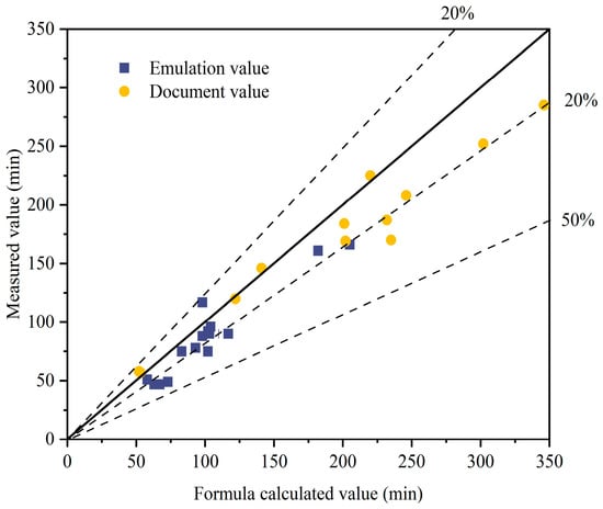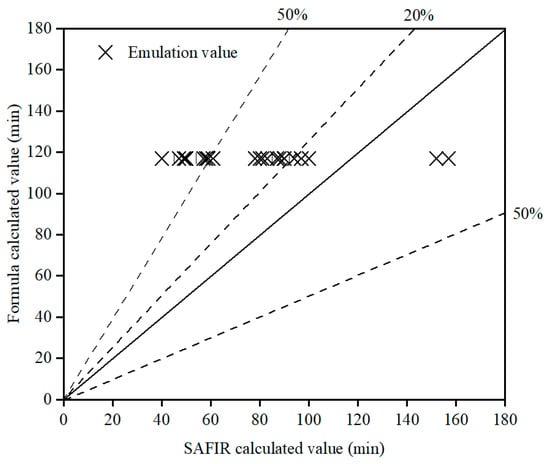Figure 20 presents a comparison between the SAFIR simulation results and the experimental data from [,,] against the outcomes of the revised calculation method. The figure demonstrates that the fire resistance obtained from the revised calculation method generally shows good agreement and tends to be on the conservative side.