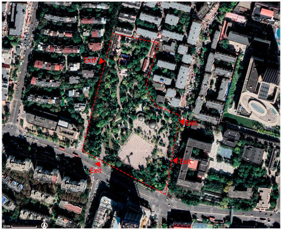 Located north of Xi Shi Street, a major thoroughfare in Tianjin’s Nankai District, the Nankai Park covers an area that is roughly 250 m × 190 m (Figure 1). This park is adjacent to Nankai Middle School on the east, and at its southeast corner is a vibrant urban intersection. A tall office building stretches from the road south of the park, and residential buildings are located in the west of the park. There is an old residential neighborhood extending northward from the park (isolated with a wall). At its main entrance in the south is a prominent square (60 m × 55 m), and in the north of the square is a community center building. Nankai Park consists of multiple areas suitable for a variety of smaller activities, including sports fields (around 9 m × 9 m), a dance area (around 9 m × 20 m), and other flexible-use spaces. With a circular plane that is approximately 30 m in radius, the hill within this park provides a scenic backdrop behind the community center building. Enclosing the park, a dedicated walking trail allows the elderly to exercise. There are four exits in total throughout the park, one to the south, two to the east, and one to the west. These diverse spatial elements create a sense of both openness and more secluded areas in Nankai Park. Given this blend of characteristics, Nankai Park is considered an ideal site for exploring how the elderly use urban parks. It is representative of other similar parks built in the cities located in the northern cities of China.