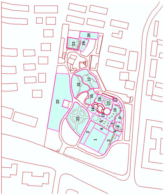 This research was conducted for seven days from 20 to 27 January 2024, with 20 January known as a bitterly cold day in the Chinese traditional calendar (大寒日: Major Cold Day, which means the coldest period of the year) (Figure 2). Accordingly, the data covered a seven-day period. The local temperatures recorded during the study fluctuated between −9 and 5 degrees Celsius. For this research, daily participatory observation was conducted from 7 a.m. to 5 p.m., according to the study of Gehl and Svarre (2013) and Low (2018) on participatory observation in public spaces [38,39]. By blending into park activities as regular visitors, researchers minimized the disruption to the elderly population under study when observing their behaviors. As far as this paper is concerned, the elderly population is defined as males aged over 60 and females aged over 55. The number of elderly visitors utilizing the walking trail and participating in activities across various park areas was meticulously recorded, while the locations and types of activity were documented on a park map (at approximately hourly intervals). Various visual cues such as appearance, activity posture, and attire were used to determine whether an individual complied with the criteria set for the elderly classification. Additionally, the movements of some elderly visitors who wandered beyond the designated walking trail were traced. Based on the observation of activity patterns, the park space was divided into 23 distinct areas (Figure 3) for the subsequent spatial behavior correlation analysis based on a certain sample size (n = 23).