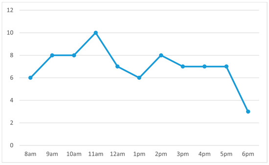 The collected data on activities performed by the elderly comprise location and activity type visualized in behavioral maps (Figure 4, Figure 5 and Figure 6). These maps indicate a close connection between the spatial environment in the park and the way in which the elderly engage with it. According to continuous observation, there are three distinct categories of activities: leisure, fitness-oriented pursuits, and social entertainment and recreation (Table 1 and Table 2). Hourly figures (8 a.m. to 5 p.m.) provide more details on the types of activities undertaken, their frequency, and where in the park they tend to take place. A consistent pattern is identified that most activities are performed around the central squares and main building, with spatial distribution found to fluctuate in other park areas throughout the day.