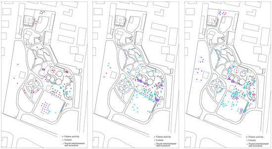 The mapping of activities performed by the elderly at 9 a.m., 11 a.m., and 3 p.m. The blue circle represents leisure activities, the purple triangle represents social entertainment and recreation, and the red square represents fitness activities.