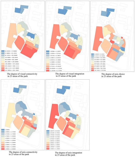 The spatial syntax of the park space, with the degree of axis connectivity, axis choice, axis integration, visual connectivity, and visual integration.
