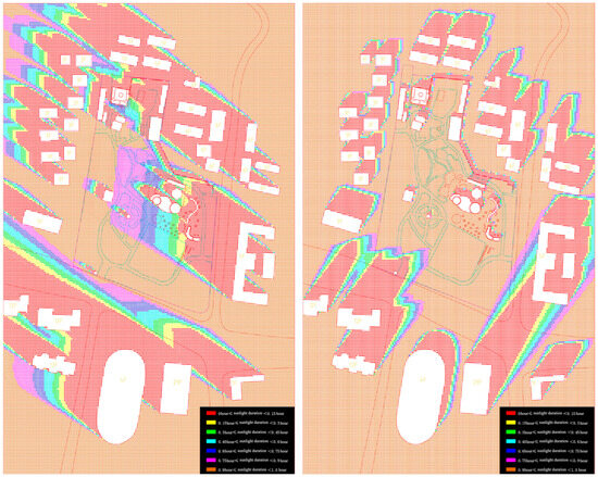 Space syntax “focuses on the properties of the space and the relationships between space and movement rather than the morphology of spaces” [42,43]. At present, it is widely recognized as an effective tool of analysis for complex urban spatial relationships [44]. Depthmap refers to “an open-source and multi-platform spatial analysis software for spatial networks of different scales” [45]. According to on-site observations, the shadow factor (of the buildings around the park) affects the distribution of activities that elderly park visitors prefer. For a better understanding of this, sunshine conditions were thoroughly analyzed using Tangent (Tangent is a product based on the AutoCAD platform for architecture, structure, plumbing, HVAC, electrical, energy conservation, sunlight, daylighting, etc., and it is a CAD plug-in) at hourly intervals from 8 a.m. to 4 p.m.