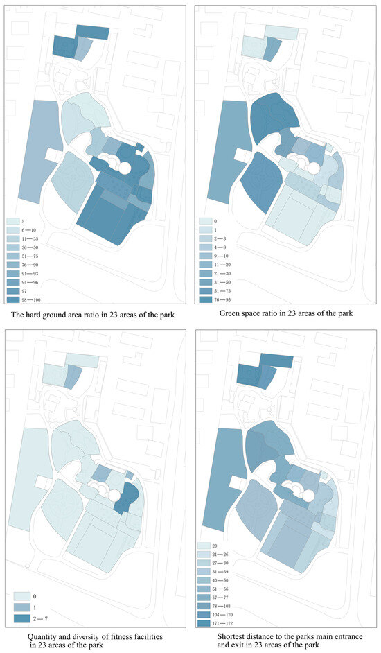 | Visual Connectivity | Visual Integration | Axis Connectivity | Axis Choice Degree | Axis Integration | Shortest Distance to the Main Entrance and Exit | Hard Ground Area Ratio | Number and Diversity of Seating Facilities | Table and Chair Combination | Quantity and Diversity of Fitness Facilities | Green Space Ratio | Green View Rate | |