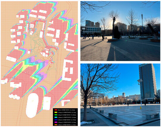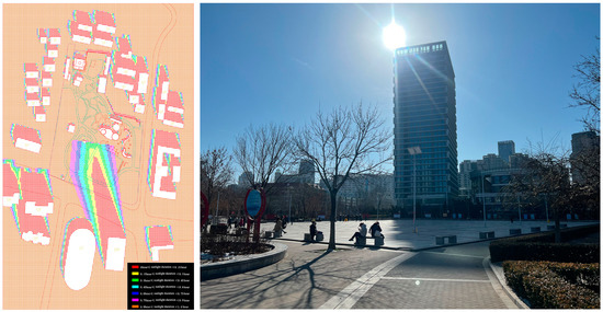 According to the solar (shadow) analysis, a significant correlation exists between available solar (shadow) conditions and the activity distributions of the elderly in cold weather. Herein, two specific timestamps are focused on for illustration: midday and afternoon. As shown in Figure 10, there is a distinct division created in the square at 11:58 a.m. due to the expansive shadow cast by high-rise office buildings to the south of the park. One area attracts many elderly visitors for public activities, while the other is attractive to none. Then at 4:02 p.m., the square is bisected in a similar way by the shadow from residential buildings located in the southwest corner outside the park, as visually confirmed by the photo. There are no elderly visitors in the shadowed area, while there is a high concentration of activity in the sunlit section of the square (Figure 11).