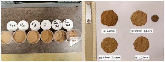 In this research, the impact of reed fiber length on bituminous binder was investigated. Four lengths of reed fibers (<0.4 mm, 0.4–0.6 mm, 0.6–0.8 mm, 0.8 mm) were selected, as depicted in Figure 1. Fibers that are excessively long may intertwine, posing challenges in blending with bitumen and causing “balling” issues. Conversely, fibers that are too short provide inadequate reinforcement, making their inclusion as a filler futile and costly [22].