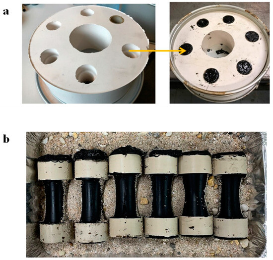 Each mold allowed for the production of six specimens simultaneously, which were later stored horizontally in a sand-filled container upon removal from the mold, as depicted in Figure 3b. These specimens underwent meticulous inspection to detect any significant pores or defects.
