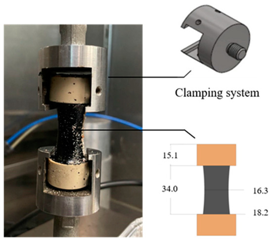 Following preparation, the specimens underwent monotonic tensile testing. The mortar samples were loaded in tension using a Universal Testing Machine (UTM, IPC, Melbourne, Australia) at a controlled displacement speed of 0.1 mm/s at 5 °C and 20 °C. The specimen fixation during loading is illustrated in Figure 4.