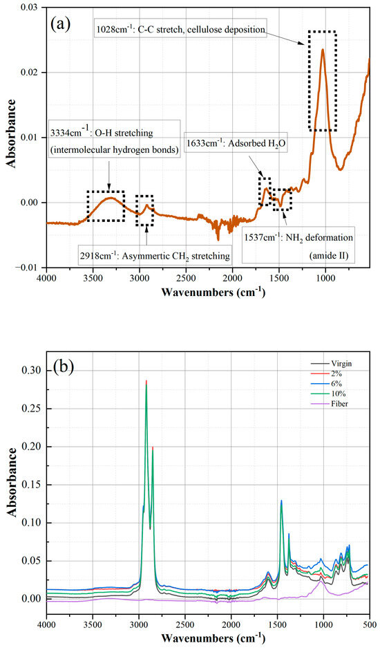 Figure 5a,b show the FTIR spectra of various samples, including virgin bitumen, modified bitumen with different amounts of reed fiber, and pure reed fiber. Key peaks observed in the FTIR spectra of reed fiber include the C-O stretch (1053 cm−1) and C-C stretch (1028 cm−1), which indicate cellulose deposition during secondary cell wall synthesis. Additionally, the NH2 peak (1537 cm−1) suggests the presence of proteins or amino acids, while the absorption peak at 1633 cm−1 indicates absorbed water—likely moisture from fiber storage—a hypothesis to be verified by testing dried fibers; further, -CH2 asymmetric stretching (2918 cm−1) and intermolecular hydrogen bonds (3334 cm−1) arise from waxes and cuticles on the fiber surface [34,35].