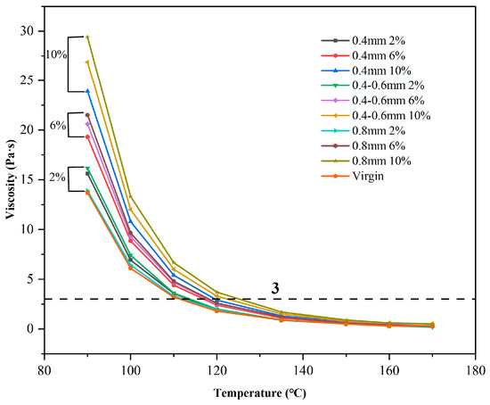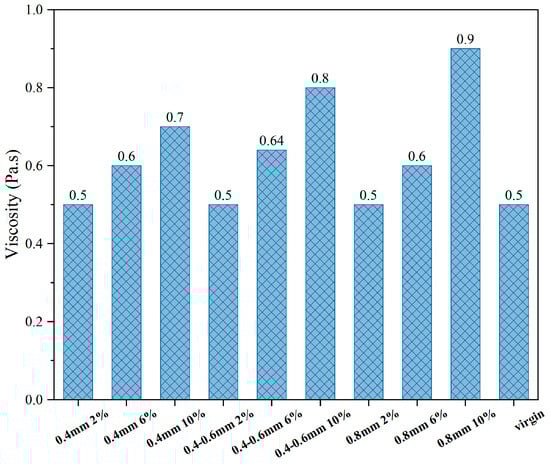 The viscosity of the reed-fiber-modified bitumen was tested using fibers of three different lengths (<0.4 mm, 0.4–0.6 mm, and 0.8 mm) and varying dosages (2%, 6%, and 10%). Viscosity serves as a critical indicator of bitumen’s flow characteristics and workability during construction. Following standard rotational viscosity test procedures, viscosity measurements were conducted at different temperatures using a Brookfield viscometer (Changji Geological Instrument CO., Ltd., Shanghai, China), adhering to ASTM D4402-14 [26].
