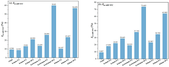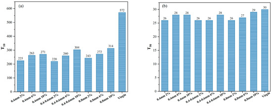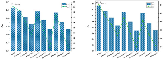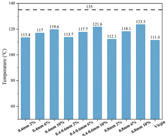 The viscosity–temperature relationship was utilized to determine the temperature at which each sample reaches a viscosity of 3 Pa·s at 20 rpm, ensuring effective compaction in practical engineering, as depicted in Figure 7. The addition of reed fiber is observed to elevate the compaction temperature, consistent with the viscosity analysis discussed earlier. Notably, the 0.8 mm fiber length at the 2% dosage exhibits a lower compaction temperature than samples with longer fibers at the same dosage, contrary to previous findings. This discrepancy might stem from difficulties in achieving uniform blending of longer fibers, resulting in a lower actual fiber dosage in the test samples.