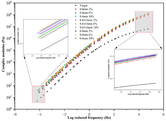 Figure 9 depicts the relationship between the complex modulus of RFMB and loading frequency, highlighting how the modulus increases with the higher reed-fiber dosage in bitumen. Additionally, greater fiber length enhances the master curve of the complex modulus, though to a lesser degree than variations in fiber dosage, aligning with results from prior viscosity experiments.