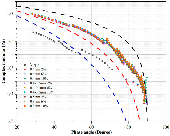 The low-frequency region pertains to bitumen performance at high temperatures, whereas the high-frequency region reflects performance at low temperatures. Upon detailed examination of the frequency spectrum in Figure 9, it is evident that fiber addition markedly enhances the modulus across all temperatures compared to virgin bitumen. Notably, in the high-frequency range, the disparity between the RFMB and virgin bitumen curves is more pronounced, highlighting a substantial impact of reed fiber addition at higher frequencies. In RFMB groups, the modulus increases by approximately 100% at high temperatures, while the difference is around 10% at low temperatures, which is relatively insignificant. A higher G* value indicates greater stiffness of the bitumen.