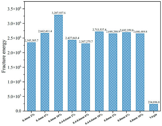 Conversely, at 20 °C, a notable enhancement in fracture energy was observed with 2% reed fiber dosage, while other fiber dosages did not show significant improvements, mirroring the strength analysis pattern. Notably, while 0.4 mm fibers exhibited considerable performance increases, the effect was slightly less pronounced than longer fibers, likely due to shorter fiber lengths limiting force transmission within the mastic.