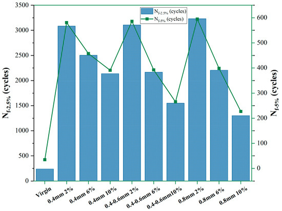 Based on these results, the addition of 10% 0.4 mm reed fibers showed the most significant improvement in bitumen tensile strength. Using AASHTO TP 101-14, the fatigue performance parameter Nf was calculated from the aforementioned data and is depicted in Figure 18 for strain levels of 2.5% and 5%. RFMB demonstrated superior fatigue resistance across both strain levels, particularly with a 2% fiber addition across all fiber lengths. Specifically, at a 5% strain level and 2% fiber dosage, fatigue performance for 0.4 mm, 0.4–0.6 mm, and 0.8 mm reed fibers was 16.8, 17.2, and 17.4 times higher than that of virgin bitumen, respectively; however, at a 10% fiber dosage, these values decreased to 11.3, 7.7, and 6.5 times, respectively. Similar trends were observed at the 2.5% strain level, with values of 13.0, 13.1, and 13.6 times higher at 2% dosage and 9.0, 6.5, and 5.4 times higher at 10% dosage.