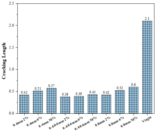 The LAS test has recently played a crucial role in evaluating the damage tolerance of bitumen binders based on macrocrack growth rate trends [38]. Figure 19 depicts crack length ( calculated from the LAS test, representing the maximum allowable crack length before sample failure. Beyond this threshold, the crack length increases abruptly, indicating sample damage. Longer crack lengths at failure are preferable as they indicate greater tolerance to crack propagation [39].
