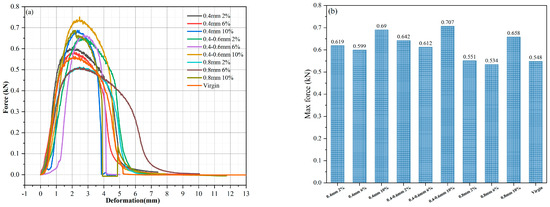 Figure 20 depicts the force–displacement data obtained from the monotonic tensile test, showing the maximum tensile force recorded for each specimen. Typically, the addition of fibers enhances the tensile strength of bituminous mortars [40]. Interestingly, when containing 6% reed fiber, the mortar showed the lowest strength among groups with similar fiber lengths, even demonstrating lower strength at 5 °C compared to the mortar without added fiber. The error bars suggest that the influence of fiber addition on tensile strength is not definitively clear. Nonetheless, at 20 °C, the addition of 2% 0.4–0.6 mm and 0.8 mm fibers showed significant increases of 3.09 and 2.59 times, respectively. This enhancement can be attributed to the reinforcing effect of fiber stiffness on the matrix, which is more pronounced at higher temperatures due to improved blending.