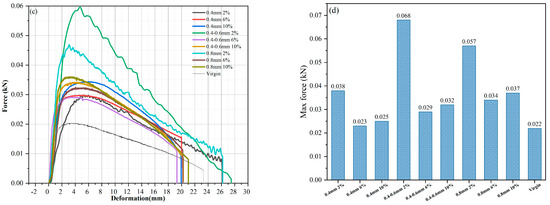 Stress–strain curves from LAS test with various reed fiber lengths: (a) all lengths; (b) 0.4 mm; (c) 0.4 to 0.6 mm; (d) 0.8 mm.