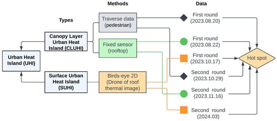 34]. The proposed framework integrates both CLUHI and SUHI measurements, providing a more holistic and robust analysis of UHIs than using either method in isolation. The framework captures a multi-dimensional view of UHIs. CLUHI measurements, which involve traverse data collection and fixed sensors, typically assess the air temperature at the pedestrian level or within the urban canopy layer, directly affecting human comfort and urban energy demand. This layer is where human activities and living spaces are most affected by UHIs. On the other hand, SUHI measurements focus on the thermal properties of surfaces using remote sensing technology. These measurements are crucial for understanding how different materials and colors of urban infrastructure absorb and re-emit solar radiation, which contributes to the overall heat profile of an urban area.