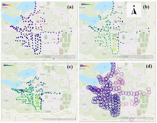 20]. The outcomes of these studies are invaluable; they measure the impact of local climate phenomena and illuminate the mechanics of urban climate, thereby aiding the development of effective mitigation strategies. Nonetheless, these weather stations have inherent limitations due to their sparse distribution, thereby offering snapshots rather than continuous spatial representations. This limitation underscores the need for more comprehensive data collection methods to capture the full scope and patterns of urban microclimates [