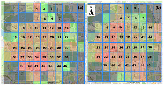 Figure 5b; there are differences in the identified ‘hot spot’ grid. However, the overall trend is similar; that is, the west side of the campus has a higher temperature variation throughout the day compared to the east side. In addition, there is consistency in the cluster with the highest temperature oscillation, that is, grid 31 through 35.