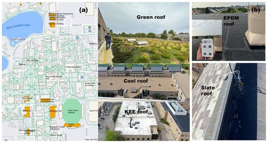 Figure 6a for building location) on August 22nd, utilizing the same devices from the initial round of traverse data collection to ensure data quality consistency. Due to the device’s battery life, they required recharging before the second installation on October 29th. Two factors determined the selection of installation sites. First, the buildings situated in hot spots identified during the first traverse data collection phase were selected. Second, the primary goal of installing fixed sensors was to enhance our understanding of how different roof materials mitigate UHIs, specifically temperature fluctuations; thus, buildings with varied roofing materials were targeted.