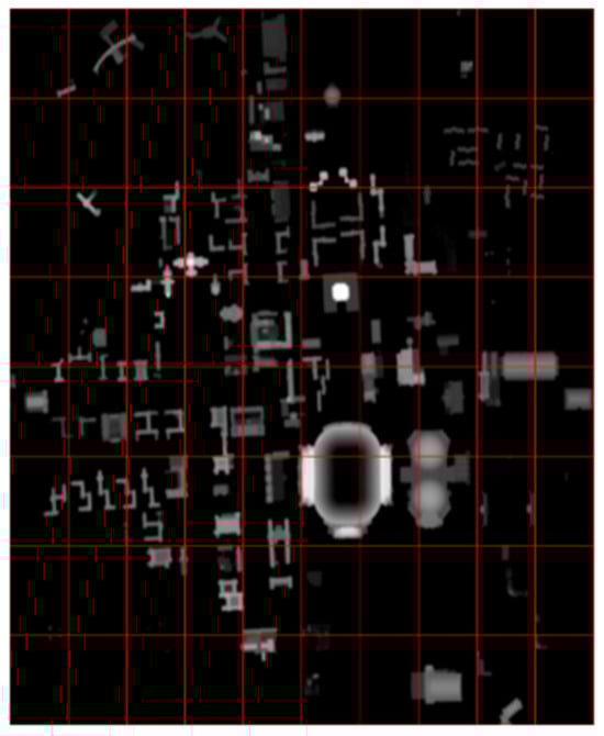Figure 8, the map is a black and white map where the whiter values demonstrate higher buildings. Therefore, the brightest white values in the image were considered as coefficient 1 and the other heights were calculated based on a proportion of their brightness compared to this value, resulting in a representation of height ratio. Equation (6) indicates the equation to solve this problem.