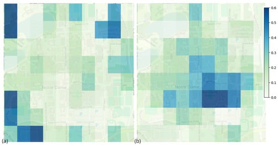 Figure 5a, certain areas on the campus have higher temperature differences compared to other ones. The green areas’ temperature change throughout the day is about 1.5 degrees Celsius lower than that of the red areas. The same method was used to process data collected in the first round, as shown in