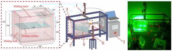 The experimental model system was self-designed, as illustrated in Figure 1. It comprises a loading device (servo motor, loading plate, pressure transducer, Programmable logic Controller), measurement subsystem 1 (laser apparatus, high precision linear guide rail, optical platform frame), measurement subsystem 2 (high speed industrial camera, high precision linear guide rail, image acquisition system), dual-module controller, and acrylic vacuum model case. To accommodate the visibility of the transparent soil, the acrylic vacuum model case was constructed from an acrylic sheet with a wall thickness of 3 cm. Internal dimensions were 40 cm 29 cm 35 cm (length width height). The side plate of the model case was removed before loading, and the servo motor was controlled to perform loading at a speed of 1 mm/s. A black shade cloth was draped around the model system to create a dark environment, ensuring the capture of clear light spots. A 2000 mW sheet laser was mounted on the high-precision linear guide rail, projecting light onto the soil within the model case. The resolution of the high-speed industrial camera was configured to 3000 × 4000 pixels and was fixed to a high-precision linear guide rail positioned at the top of the model box. Both sets of high-precision linear guide rails operate in unison to synchronize the movement of the two measurement subsystems, thereby facilitating “CT” scanning of the slope model at consistent intervals.