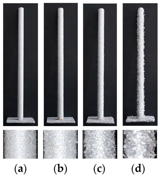 Model piles for transparent soil experiments: (a) No. 1 (0.1–0.2 mm); (b) No. 2 (0.2–0.5 mm); (c) No. 3 (0.5–1.0 mm); and (d) No. 4 (1.0–3.0 mm).