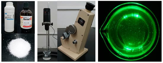The transparent clay specimens were made of fused quartz and pore fluid with matching refractive index. In this investigation, the particle size of the fused quartz sand ranged from 0.5 to 1.0 mm, with an average particle diameter (d50) of 0.62 mm. The refractive index of the pore fluid made by mixing N-dodecane and White Oil 15 in the ratio of 1:20 by mass at 25 °C reached 1.4585 (Figure 3). In this case, the transparency of the configured soil could be up to 20 cm, and distinct light spots could be formed under laser irradiation.